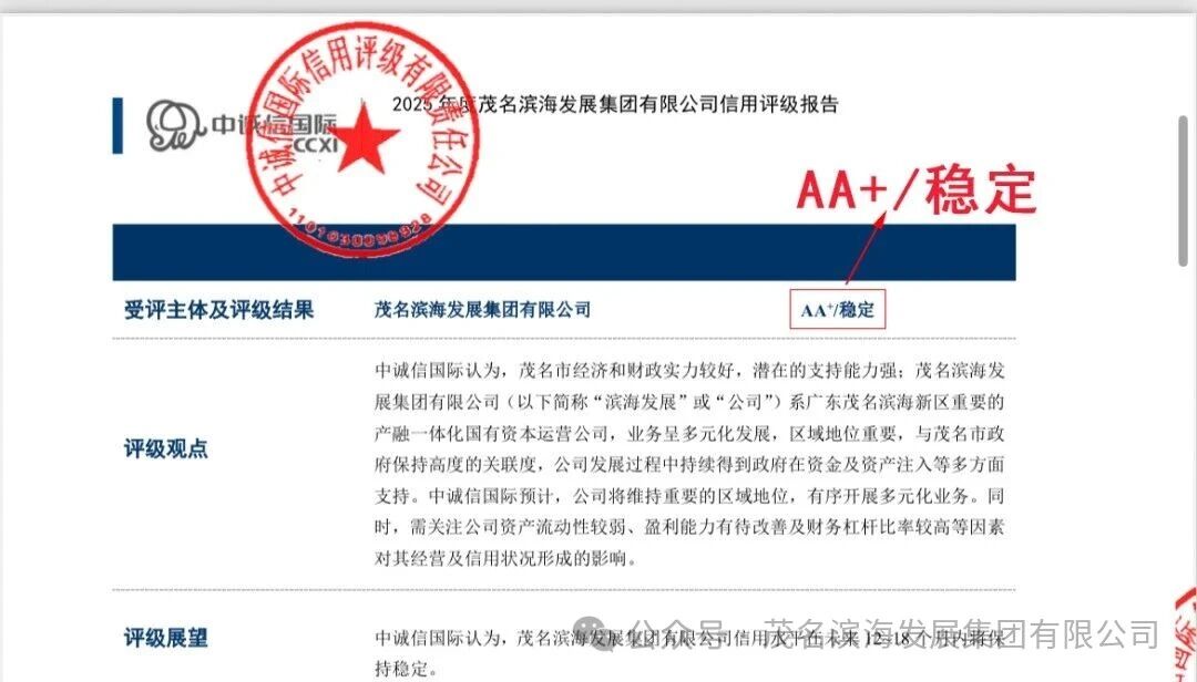 2025年9月30日,茂名滨海发展集团有限公司(以下简称“滨海发展集团”)迎来发展史上的重要里程碑——国内权威信用评级机构中诚信国际信用评级有限责任公司正式发布评级报告,评定集团主体信用等级为AA+,评级展望为“稳定”。